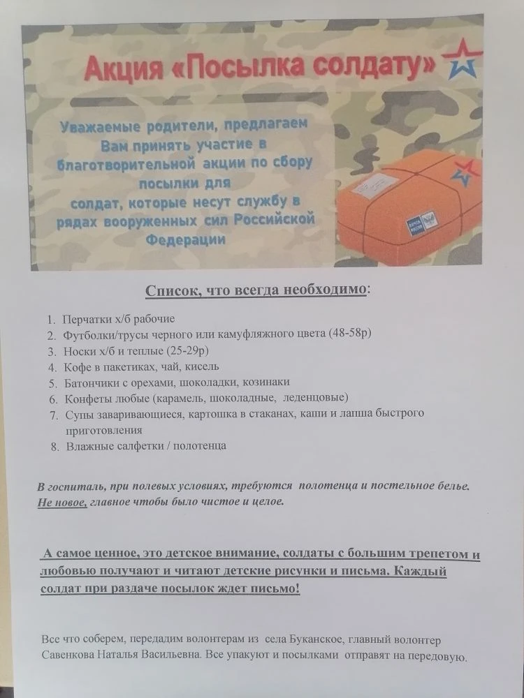 В преддверии празднования Дня защитника Отечества сотрудники, дети, родители нашего детского сада присоединились к акции волонтерского движения «Тыл СВОим» по сбору посылки солдатам к 23 февраля. 12 февраля мы передали собранную помощь и подарки от ребят волонтерам. В ближайшее время представители движения сформируют посылку и отправят на передовую солдатам. Ждем обратную связь от Защитников нашей Родины!