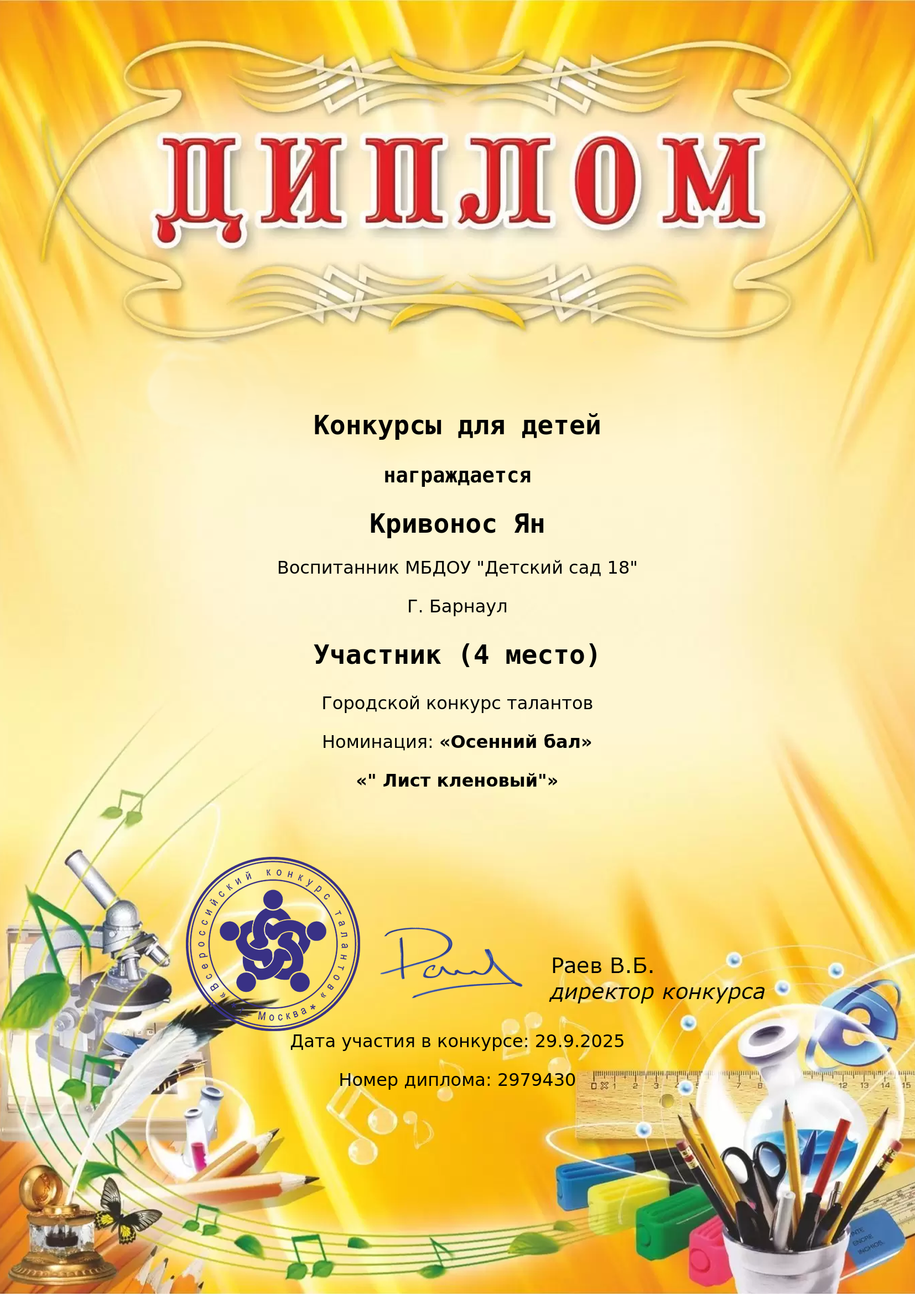 Достижения воспитанников Диплом победителя (участника) творческого конкурса Диплом победителя (участника) творческого конкурса