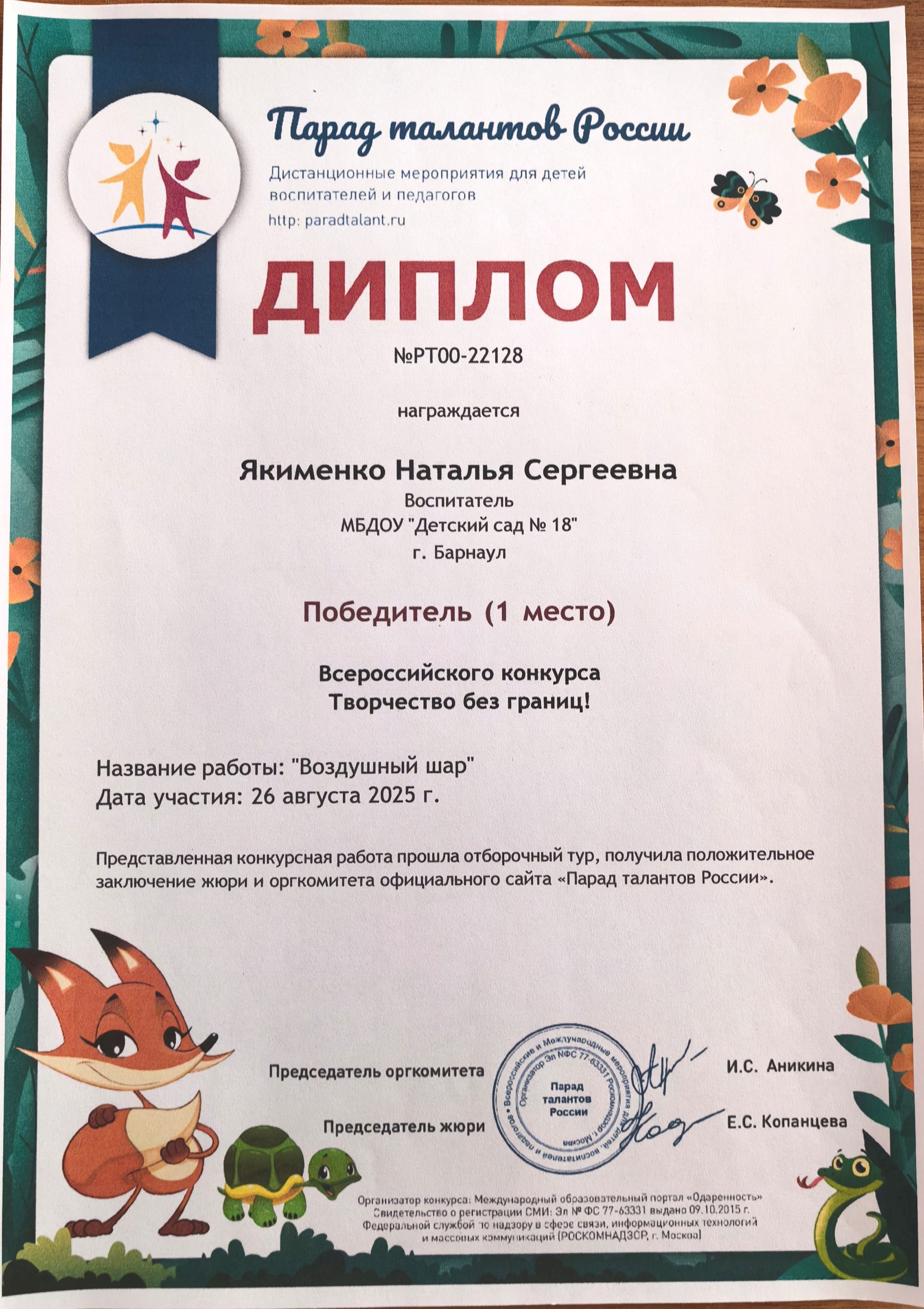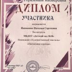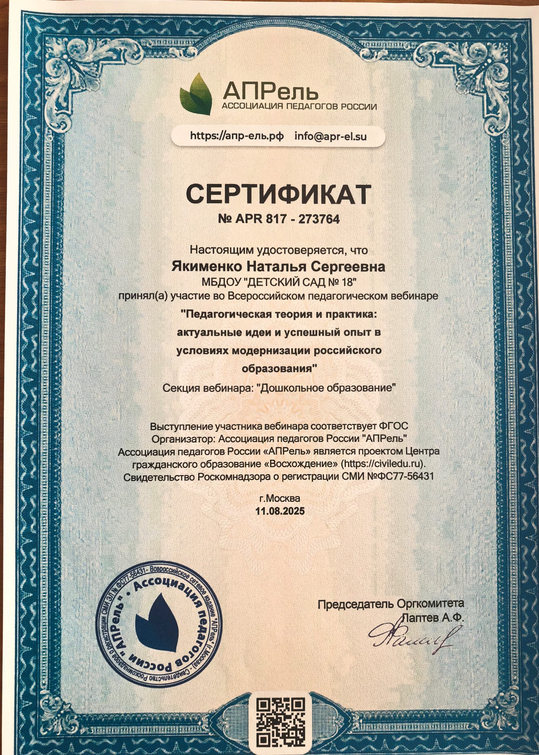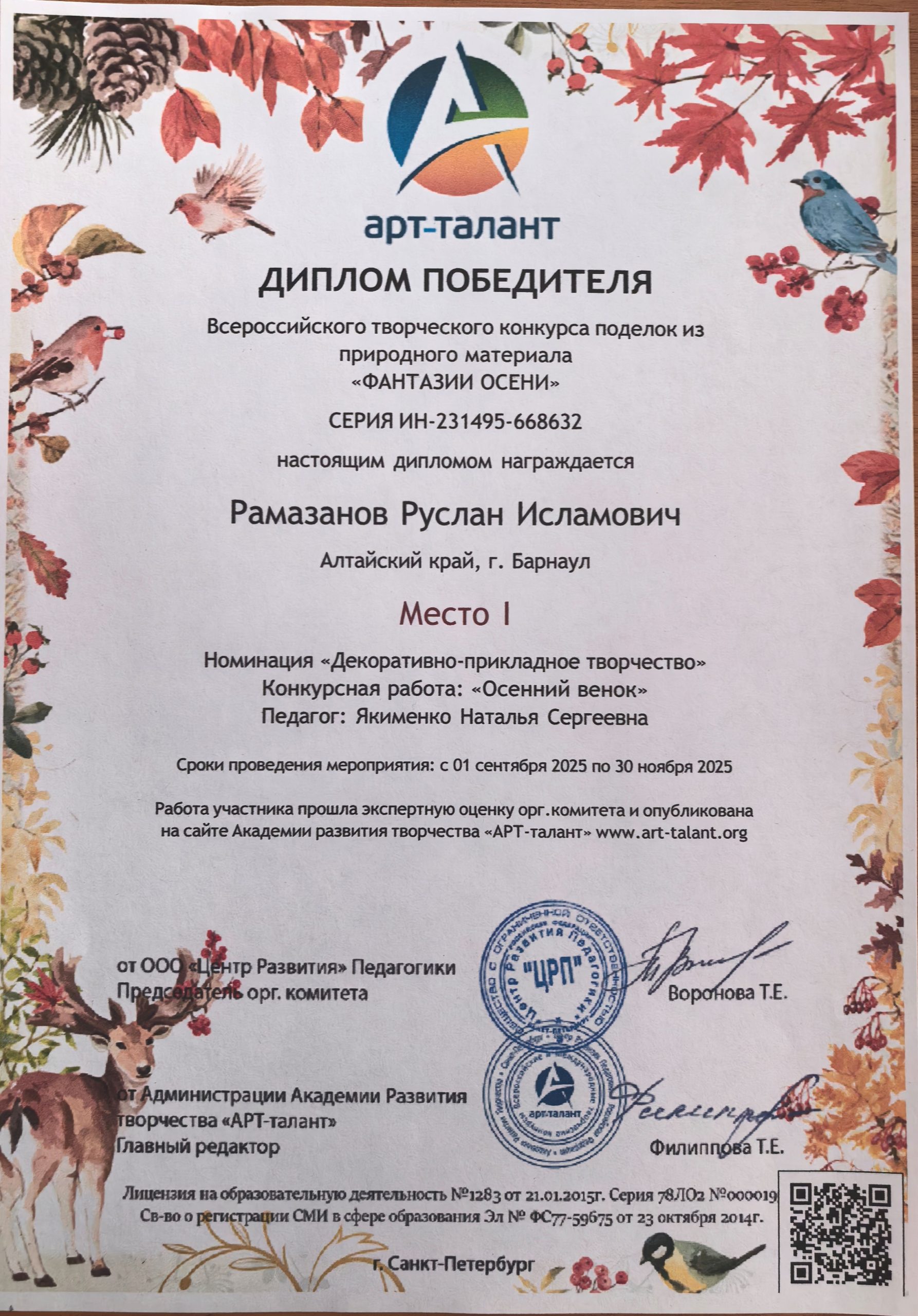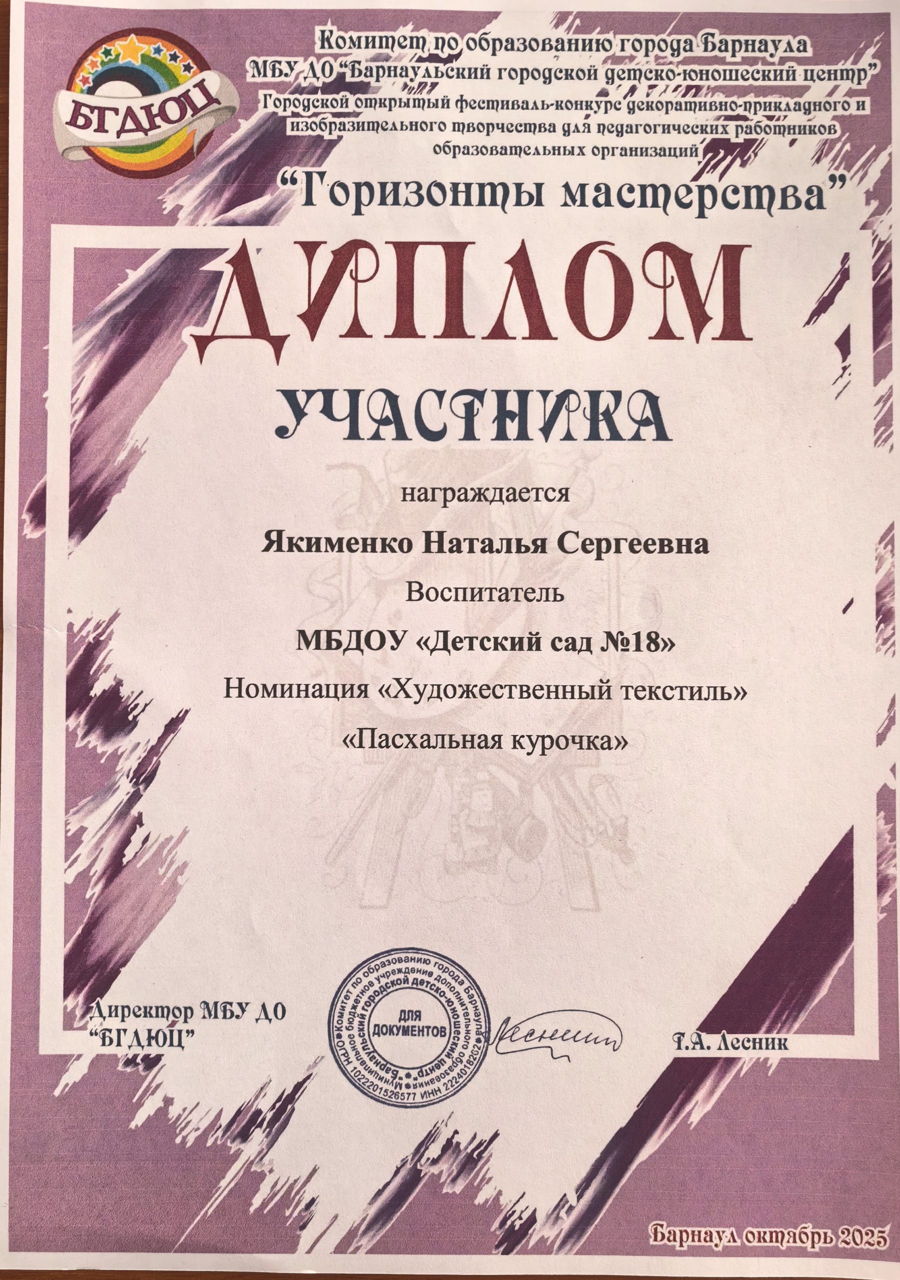 Курсы повышения квалификации: КГБУ ДПО “Алтайский институт развития образования имени Адриана Митрофановича Топорова” по теме «Инклюзивное образование детьми с ограниченными возможностями здоровья в дошкольной образовательной практике», 2020г